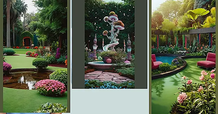 This garden is like a secret hideaway, a place where you can escape from the hustle and bustle of everyday life and just relax. It’s got everything you could want: lush greenery, colorful flowers, and even a cool swimming pool! Imagine lounging on those pink chairs with a good book, listening to the birds chirping and feeling the warm sun on your face. You might even spot a few friendly garden gnomes hiding amongst the flowers, but don’t tell anyone!