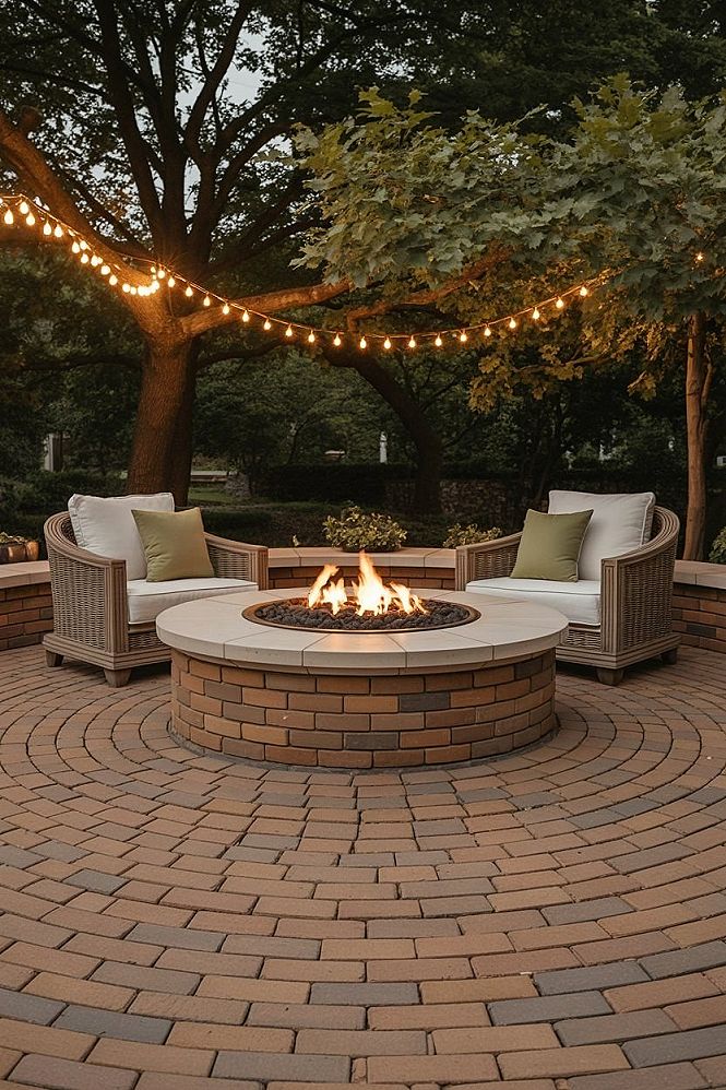 Discover stunning backyard fire pit ideas that create a cozy ambiance for your outdoor living space. Imagine a beautiful brick patio with a fire pit, illuminated by enchanting string lights, perfect for intimate gatherings.