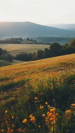 The way the light catches the grass and flowers is seriously magical, right? It’s like those scenes in movies where the hero is about to have a life-changing adventure! You can almost hear the chirping of birds and feel the excitement building as you stand at the top of that hill, looking out at the world. Who knows what mysteries those hills are hiding? Maybe a secret waterfall, or even a magical dragon sleeping in the shadow of a tree!