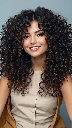 Having hair like this is kind of a personality trait in itself. Your curls have a life of their own, and the bangs are like their sassy sidekicks. They might not always cooperate perfectly, sometimes deciding to split in weird directions, but when they catch the light just right? Pure magic. Plus, they make smiling in photos look effortless and extra bright, proving curls and bangs are totally a winning combo.