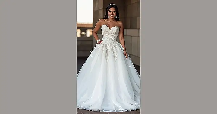 Planning a wedding? This dress screams “fairytale princess!” Just imagine twirling on the dance floor in that huge, gorgeous skirt. It’s like wearing a fluffy cloud made of dreams. And that sparkly headband? Total bonus points for looking extra glam on your big day!