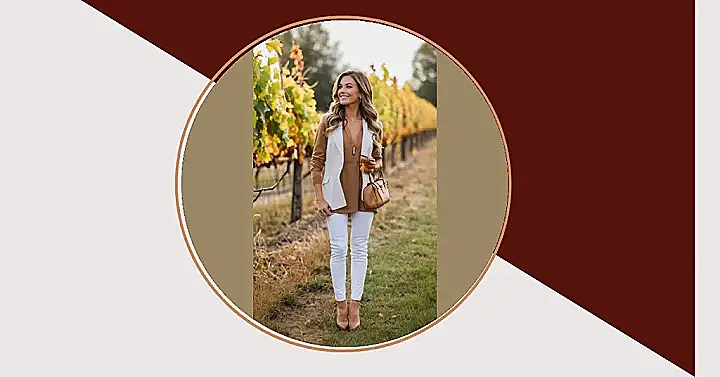 This outfit screams “I’m ready for a wine tasting and maybe a little grape stomping!” It’s all about cozy comfort with a touch of chic. The white blazer gives a polished look, while the tan top and white jeans are perfect for a day out in the crisp autumn air. And let’s not forget the adorable little brown purse – it’s just the right size for a bottle of wine (or maybe a whole case… we don’t judge!) Plus, the fall colors of the vineyard in the background make this outfit even more fabulous.