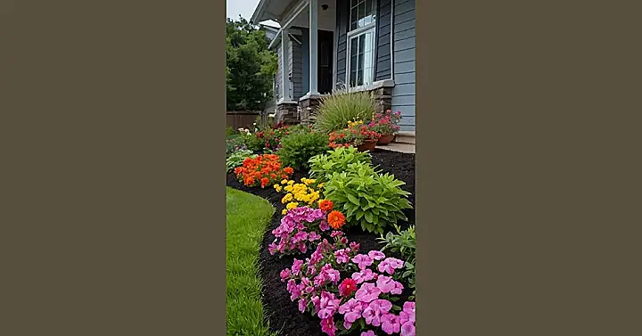 This flower bed is like a rainbow exploded in front of a house! There are red, orange, yellow, and even a splash of pink flowers, all peeking out from the lush green leaves. The flowers are so bright and cheery, it’s like they’re trying to say “good morning” to everyone passing by. And that fancy stone border? It’s like a special frame for this super cool garden art. It’s like the house is wearing a flower crown, and we all know how much better that makes everything look!