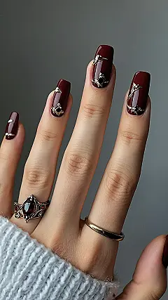 These nails are like a fancy dress party for your fingertips! The deep burgundy is perfect for fall, and the glittery gold accents are like the little sparkles you see in the leaves when the sun hits them just right. It’s like someone took all the good stuff from fall and put it on your nails.