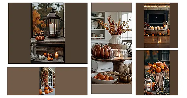 Now, let’s talk about the best part – the colors! This picture uses warm, inviting tones like browns, oranges, and white. It’s the perfect combination for a fall-themed home decor. You can recreate this look by using similar colors in your own home. Maybe you’ll add a brown throw blanket to your couch, swap your white candles for orange ones, or bring in some orange and brown cushions for a cozy touch. And don’t forget to add some cute little pumpkins! They’re the perfect way to say “It’s fall y’all!”