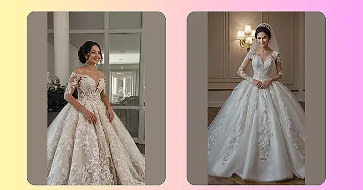 Planning your big day? Don’t forget the most important part – the dress! This one’s got all the princess vibes with its flowing skirt and fancy lace. The bride in the picture looks like she’s ready to waltz straight out of a fairytale. Just imagine twirling around the dance floor in this, feeling like a total queen…with or without a prince!