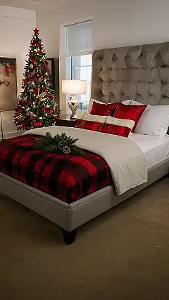 **Paragraph 1:** Forget reindeer games – this bedroom is ready for some serious Christmas cozy time! Check out that super-soft, fluffy white throw; I bet it feels amazing after a snowball fight (or a marathon of holiday movies). The red velvet bedding adds a festive pop of color, and those pillows? They look like they’ve been hand-stitched by elves! The little Christmas tree in the corner is adorable and perfectly sized to not take up the whole room. It’s like Christmas threw a slumber party, and everyone’s invited!