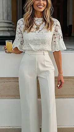 This outfit is the perfect mix of fancy and comfortable – ideal for that office holiday party where you want to impress your boss but also be able to actually *dance* without feeling like you’re wearing a potato sack. Imagine yourself gliding onto the dance floor, looking like a chic ice cream sundae in this all-white ensemble. The lacy top is super festive, adding a touch of sparkle without being too over-the-top, and those wide-leg trousers mean you can move freely, so get ready to show off your best moves!