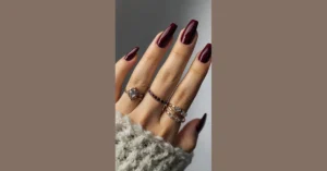 These nails are seriously festive! That deep burgundy is perfect for all those cozy December get-togethers, and it’s like a grown-up version of Christmas red. Imagine sipping hot cocoa by the fireplace, showing off these gorgeous, pointy nails – way better than those elf-themed nail stickers your little cousin loves, right? Plus, those rings add a touch of fancy that’ll make you feel like royalty.