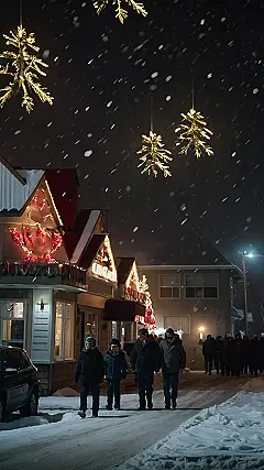 Imagine this: it’s Christmas in Canada, and the snow is falling like crazy! The streets are all decked out with twinkling lights shaped like little pine trees, hanging from above like magical, golden snowflakes. A family is bundled up, strolling along, clearly on a mission to find the best hot chocolate in town (or maybe just the warmest spot to escape the blizzard!). They’re looking super cozy, despite the freezing temperatures, and you can practically feel the festive cheer radiating from the image. It’s a perfect picture of a Canadian Christmas adventure – a snowy, slightly chilly, but undeniably charming scene.