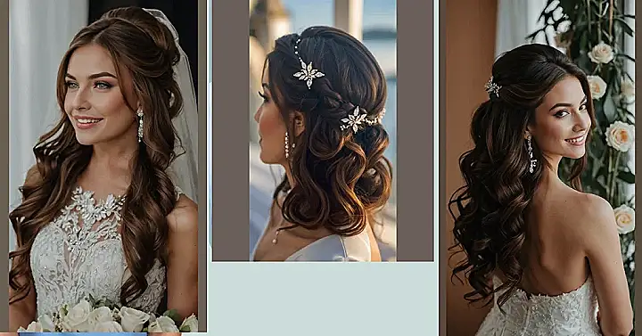 Getting ready for a big day like a wedding is kind of like trying to pick your favorite song – impossible! But when it comes to hair, the half-up half-down style shown here is basically the cool best friend of bridal looks. It’s like saying, “I’m elegant enough for grandma’s approval, but I can still totally headbang (gently!) to the reception band.” And let’s be real, adding that sparkly bit just takes it to a whole new level of fabulous, making you feel like you just stepped out of a fancy movie where everyone has perfect hair.