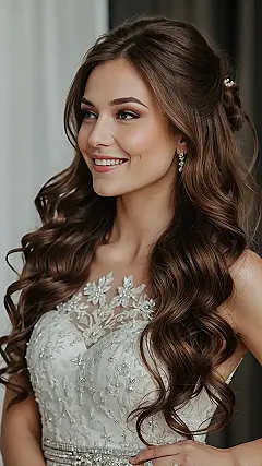 This style isn’t just pretty, it’s practical too. That little bit pulled back means you don’t have to worry about your hair photobombing every picture or getting tangled in your accessories, like those beautiful earrings she’s wearing. It keeps things tidy where you need it but lets the rest of your glorious hair do its thing, bouncing and shining like a celebrity on the red carpet. It’s the perfect balance for looking elegant while still feeling like you can actually, you know, move around and celebrate without a hair disaster.