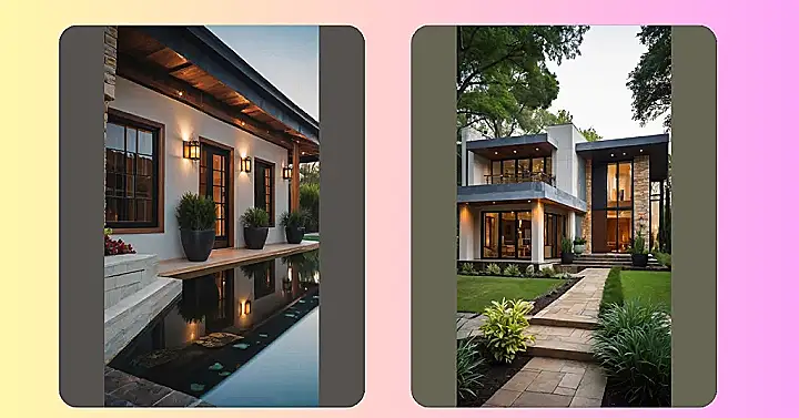 You’ve got the best of both worlds here: the warm, inviting vibe of a traditional house, but with an exterior that screams “I’m stylish and I know it!” Plus, that walkway leading up to the house? It looks like a path straight into a home that’s ready for a party, a cozy movie night, or maybe even a top-secret mission. Just add friends, snacks, and a whole lot of imagination!