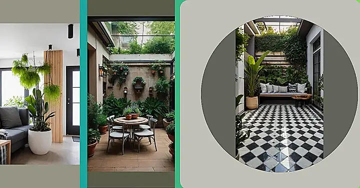 Imagine having a secret garden, right inside your house! This picture shows a super cool indoor courtyard—it’s like a mini jungle, but way more stylish. There’s a comfy table and chairs perfect for afternoon tea (or maybe a secret meeting of plant-lovers?). The walls are covered in pots bursting with greenery, hanging like magical, leafy decorations. It’s like stepping into a fairytale, except instead of a prince, you’ll find adorable potted plants.