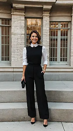 This picture shows a young woman rocking a seriously chic office outfit! It’s like a power suit, but way more fun and modern. Imagine walking into your first big presentation or even just impressing your teachers with this look. That white shirt and black jumpsuit combo is effortlessly stylish – think “sophisticated, but I still know how to have fun.” It’s the perfect mix of professional and “I’m ready to take on the world” attitude. No stuffy suits here!