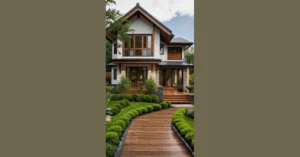 You’ve got the best of both worlds here: the warm, inviting vibe of a traditional house, but with an exterior that screams “I’m stylish and I know it!” Plus, that walkway leading up to the house? It looks like a path straight into a home that’s ready for a party, a cozy movie night, or maybe even a top-secret mission. Just add friends, snacks, and a whole lot of imagination!