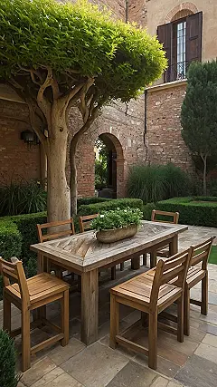 Imagine chilling here with your besties, maybe learning how to make nonna’s famous lasagna! This Italian garden setting is like stepping into a movie β you’ve got brick walls that look super old-school cool, perfectly trimmed bushes giving major hedge-maze vibes, and a huge, leafy tree providing the best natural shade ever. Who wouldn’t want to escape studying for a math test to hang out here?