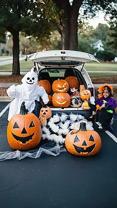 This picture is like a spooky party waiting to happen! You’ve got a car decked out for Halloween, a little ghost-buster in training, and enough candy to make your teeth ache! This is exactly what you need to make your own Trunk or Treat awesome. Think about it: You could have a haunted car, a spooky scene, or even a funny character, like a zombie or a werewolf! Just make sure to have some fun with it!