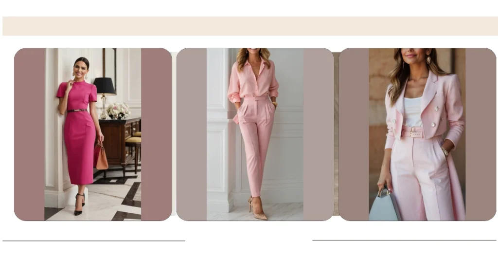 This outfit is totally rocking the “pink women outfits” vibe, but with a grown-up twist! It’s like a boss lady’s take on a pajama party. Imagine walking into school with this— heads would turn! The creamy white pantsuit is super chic, and that sweet pink belt and shoes? They’re the perfect pop of color, like adding sprinkles to your favorite cupcake. Who needs a boring uniform when you can rock this amazing, confident look?