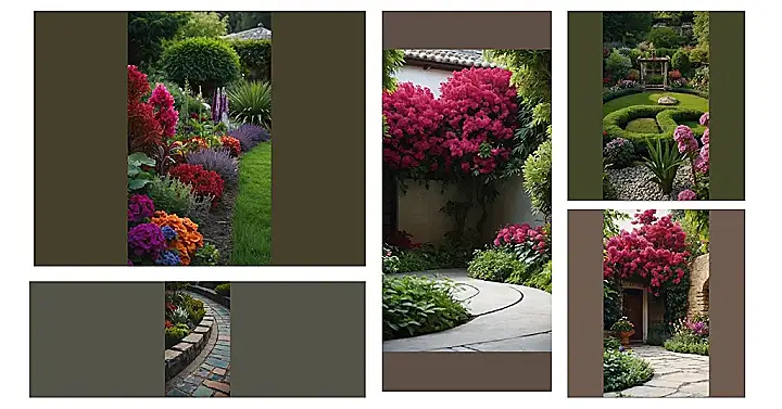 This garden looks like a party for your eyes! It’s bursting with color, from the bright reds and pinks to the soft purples and oranges. It’s like someone took all the prettiest flowers and just threw them together, and luckily it worked out beautifully. There’s a big, green bush in the middle that’s just chillin’, watching all the flowers have a good time. This garden is like a big hug for your soul, full of sunshine and joy.