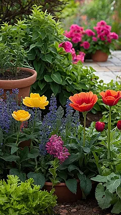 And check out that terracotta pot – it’s like a cozy little home for those bright orange and purple flowers. It’s the perfect spot to stop and smell the roses… or whatever other amazing-smelling flowers are hiding there! I bet the air smells sweeter than a candy shop explosion in this garden! The whole scene is so peaceful and pretty, it’s almost enough to make you forget about homework (almost!).