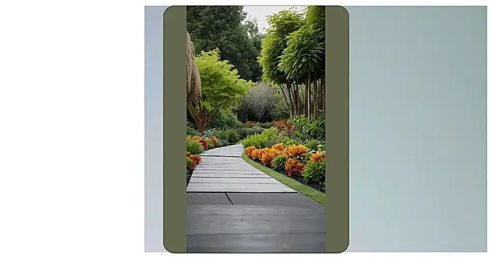 Imagine a beautiful home garden, but instead of just flowers and green grass, it’s a magical wonderland! Picture a winding wooden path that leads you through lush green bushes and vibrant orange blooms. It’s like a secret pathway into a fairytale, where the air is fresh and the sun peeks through the leaves, creating a cozy and inviting atmosphere.