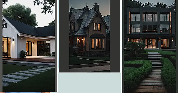 This house is like a fancy, grown-up version of a gingerbread house, with lots of windows so you can peek inside and see all the cool stuff. It’s got sleek lines, a bit of a mysterious vibe, and a lawn so perfectly manicured it looks like a giant green carpet! Imagine sitting on that patio and just relaxing with a good book – you’d feel like you were in a movie!