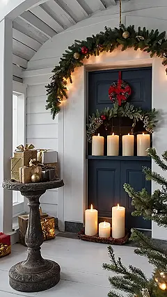 This picture is pure Christmas magic! Imagine walking up to this porch – it’s like stepping into a holiday movie scene. There’s a gorgeous garland draped above a dark blue door, twinkling with lights and looking extra festive. The presents all wrapped up neatly on the little table add to the excitement, making you want to sneak a peek to see what’s inside. And all those candles? They’re the perfect touch, making the whole place feel warm and inviting, ready for Santa’s arrival – or maybe just a hot cocoa night!