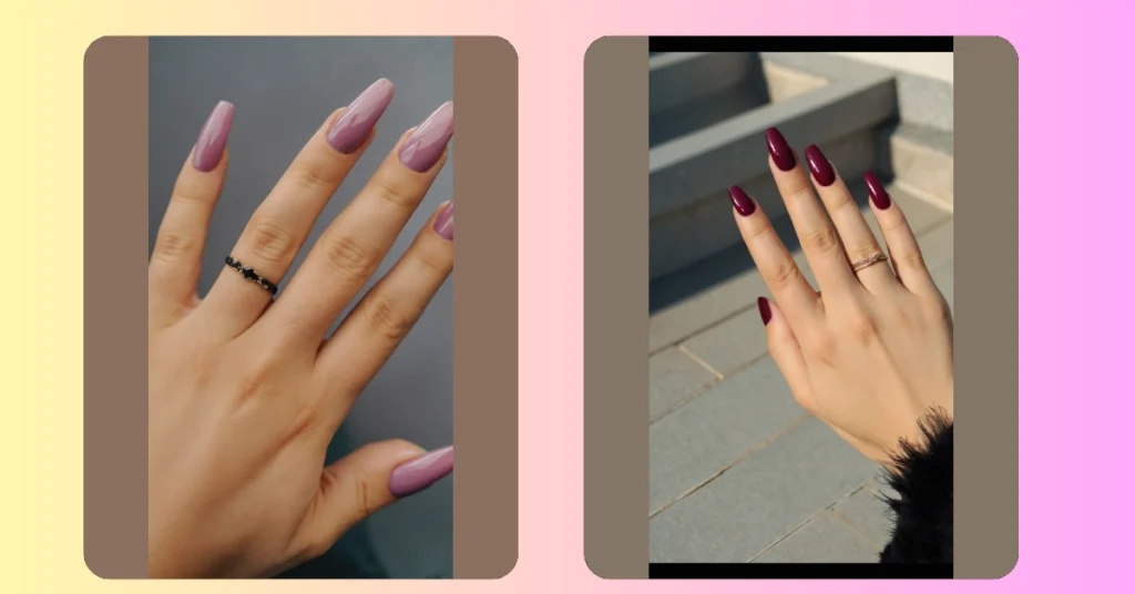 This gorgeous shade of purple is the perfect way to channel your inner autumn queen. It’s like a cozy sweater for your fingertips! The long, almond shape gives them a super chic vibe, and the sparkling rings are like the perfect accessories to complete the look. They’re like those extra sprinkles on top of your favorite ice cream – you just can’t get enough!