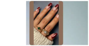 This nail art is giving us major fall vibes! The deep green polish is like the color of the leaves when they first start to change, and it’s super chic. And that ring? It’s like a little piece of autumn jewelry, with its colorful stones and fancy design. It’s almost like the ring is saying, “Hey, look at me! I’m a little bit extra, but that’s just my autumn style.”