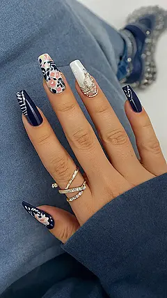 Seriously, these nails are the perfect blend of edgy and elegant. The dark blue is super on-trend for winter, and those little floral designs add a touch of whimsy. Plus, the sparkly details? They’re like tiny, glamorous icicles! They would look amazing with a cozy sweater and jeans, or even dressed up for a holiday party. Bottom line: ditch the basic winter manicure and get yourself some of these dazzling beauties.