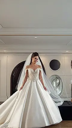 And that’s not all! The long sleeves are super chic, adding a touch of sophistication, and the train is long enough to make a dramatic entrance. The best part? You can totally picture her twirling around the dance floor, feeling like she’s floating on air, scattering sparkles as she goes! It’s the perfect combination of timeless grace and modern flair – and let’s be honest, that’s what every bride deserves on her big day.