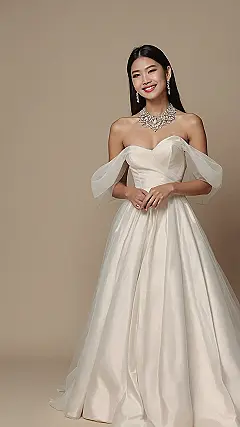 This ball gown is so dreamy, it’s like stepping into a princess movie! Just imagine twirling around in this beautiful, flowing dress – you’d feel like you could conquer anything! The off-the-shoulder design adds a touch of modern flair, and that sparkly necklace? Pure magic! It’s the perfect outfit for a special occasion, whether it’s prom, a fancy party, or even just a really epic day at the mall (with a stop for ice cream, of course!).