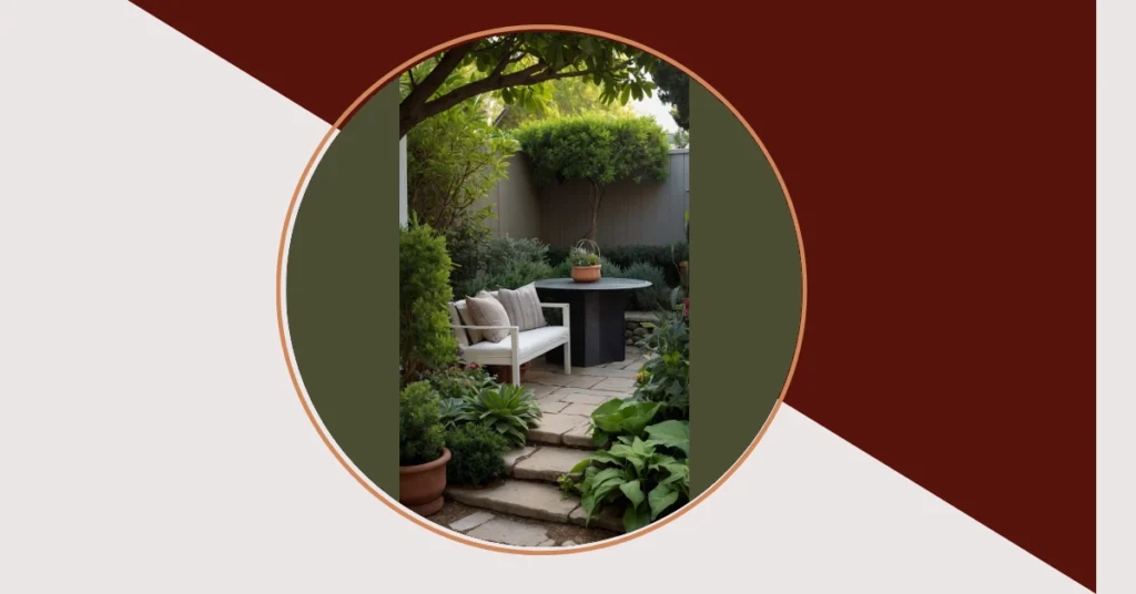 This picture shows a totally chill backyard scene, like something you’d find in a Canadian home, but way more stylish! Imagine sipping lemonade on that comfy white bench, surrounded by lush greenery. The stone pathway is super inviting, and the little succulent in the pot adds a touch of desert flair to this otherwise very green and leafy paradise. It’s the perfect spot to relax after a long day of, well, whatever grade 9ers do these days! Maybe homework? Or maybe just staring at your phone?