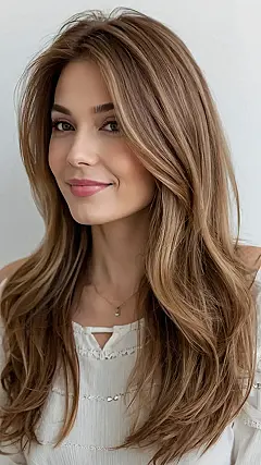 This picture shows off some seriously gorgeous long layers! Imagine walking down the hall, your hair flowing like a warm caramel waterfall – that’s the vibe we’re going for. It’s like a supermodel stepped out of a magazine, but totally achievable for you. Long layers are super versatile, you can wear it straight and sleek or add some waves for extra bounce – it’s the ultimate hairstyle chameleon! It’s perfect for girls who want a look that’s both effortlessly chic and seriously stylish. Think less “I tried too hard” and more “I woke up like this” (even if you spent a little time perfecting it!).