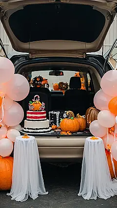 This picture shows you a trunk or treat setup that’s seriously next level! It’s got everything you need to make your car the coolest spot on the block, from a super cute pumpkin cake to a spooky ghost table. Who needs a haunted house when you can have a haunted car? Seriously, this car is so decked out, even Dracula would be impressed!
