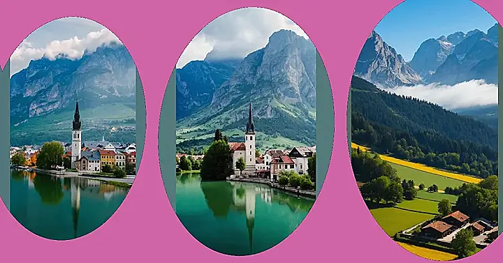 This picture is like a postcard from a storybook! It shows a tiny town nestled between big, beautiful mountains, and it looks so peaceful. The houses are old and charming, with lots of wood and colorful paint, and there’s a little river running through the middle of it all. It looks like the kind of place where people walk around slowly, enjoying the sunshine and the fresh air. It’s a place you’d want to visit and just wander around for a while, maybe even buy some local crafts and have a picnic by the river. You can almost imagine the smell of fresh bread from a bakery, or the sound of birds singing in the trees. It’s just the kind of place that makes you wish you could live there forever!