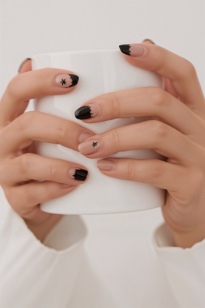 #1 Chic Star Nail Designs: Trendy Nude & Black Almond Nails