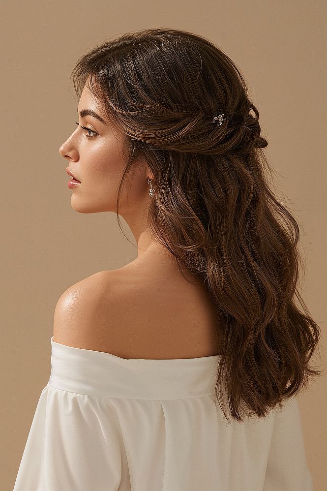 Explore sophisticated bridal hair half updo options, ideal for ‘Loose Hair Wedding Styles’ and creating a beautiful blend of elegance and comfort. This style is perfect for brides and bridesmaids alike.