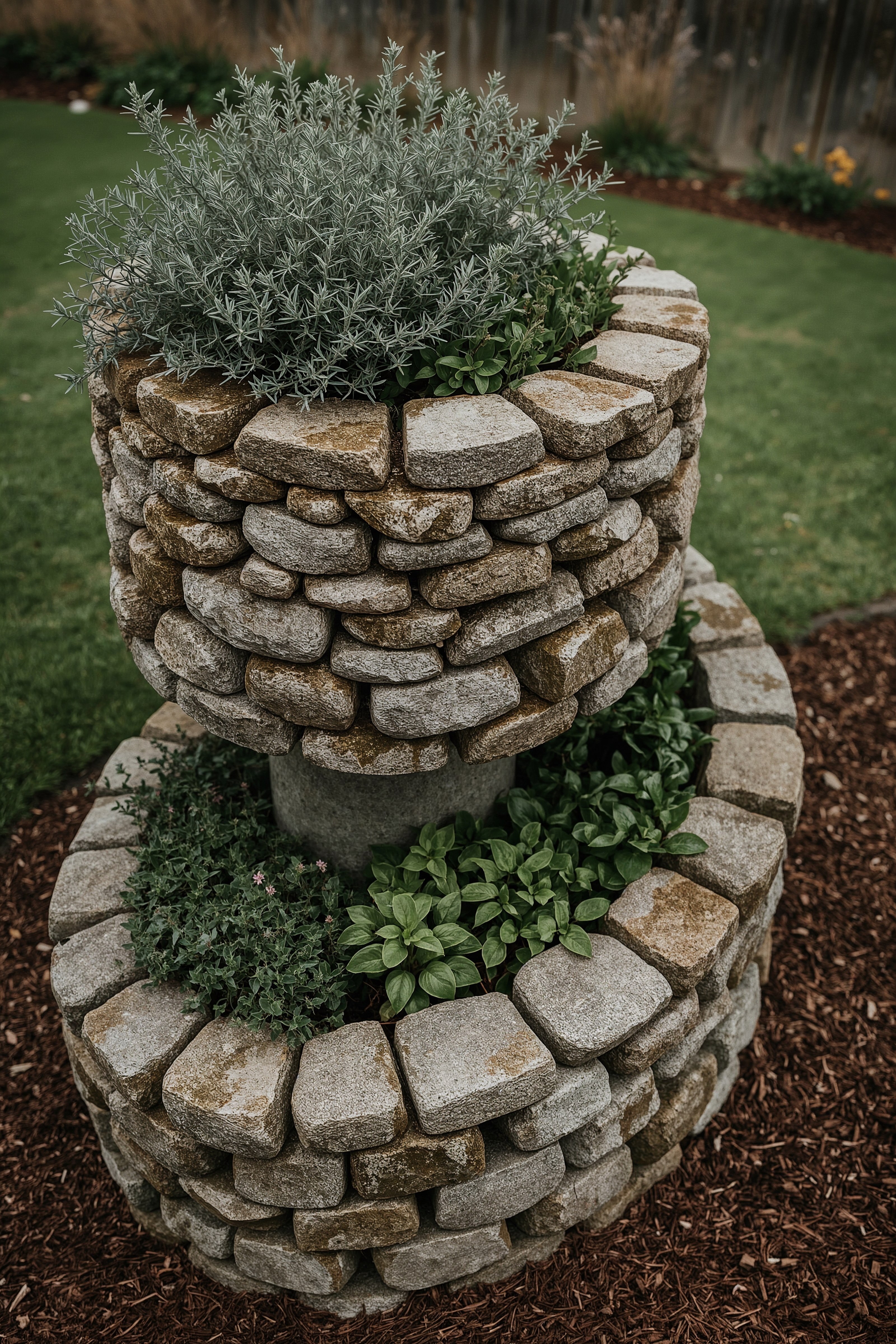 A stunning tiered herb garden spirals upward with stacked stones, each level brimming with fragrant rosemary, basil, and thyme. This unique garden bed idea creates visual drama and makes harvesting a breeze.