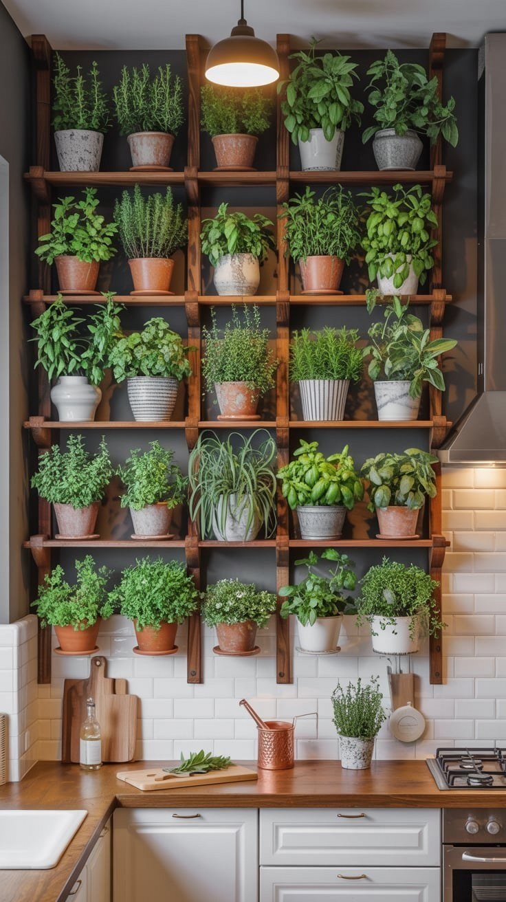 Transform your kitchen into a culinary oasis with a wall herb garden featuring a vertical trellis. This design adapts wood vegetable trellis methods for elegant, small-space indoor growing.