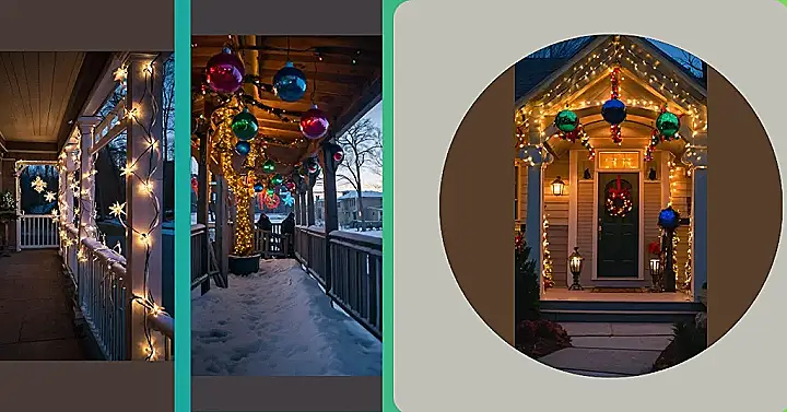 Picture this: It’s a chilly Christmas Eve, snow is softly falling, and you’re snuggled up on a porch, surrounded by twinkling lights and giant, colorful ornaments that look like they’re straight out of a candy shop! Those aren’t your average outdoor Christmas lights; these are serious statement pieces, hanging from a cozy wooden canopy, making this winter wonderland even more magical. It’s the kind of scene that makes you want to grab a mug of hot chocolate and just breathe in the festive air – maybe even sing a carol or two (off-key, of course, because that’s part of the fun!).