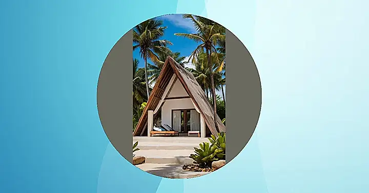 This resort design is like if a fancy camping tent and a cozy beach house had a baby! It’s got this super cool A-frame roof, probably to keep the sun off or maybe for epic rain dances (if that’s your thing). Either way, with those palm trees waving in the background, you know you’re in for some serious relaxation. Just imagine chilling on that deck chair, sipping a coconut drink, and finally finishing that book you started like, six months ago!