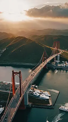This picture shows a beautiful bridge soaring over the water, connecting land on either side. It looks like a giant red slingshot, ready to launch cars across the bay! You can see the little cars driving across the bridge, looking like tiny ants crawling on a giant red string. It’s almost like a giant game of connect-the-dots, with the bridge as the line!