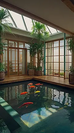 Imagine having your own little piece of paradise right inside your house! This indoor pond is like a secret garden, with palm trees swaying gently and sunlight streaming through the skylight. It’s a peaceful escape from the hustle and bustle of everyday life, a place where you can relax and watch the colorful fish swim around.