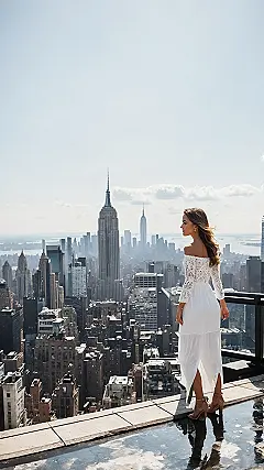 Look at that incredible view! Standing way up high above the concrete jungle, it feels like you could almost touch the clouds. Getting shots like this is what ‘new york photography’ dreams are made of – capturing the vastness of the city with landmarks like the Empire State Building standing tall. You almost expect King Kong to swing by! It’s probably super windy up there, maybe she’s just trying to make sure her fabulous dress doesn’t fly right off into New Jersey.