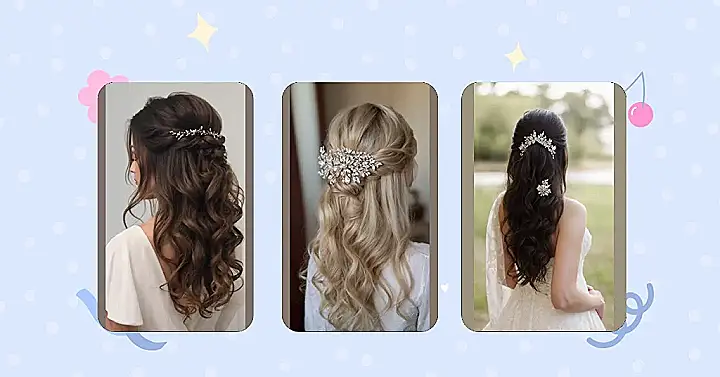 And how awesome is that sparkly hair accessory? It’s like a tiny, glittering vine woven right into the waves, turning a beautiful hairstyle into something truly magical and making any bride feel like total royalty. This little touch of bling really makes the “half up bridal” look pop, adding just the right amount of sparkle without going overboard. So, if you’re dreaming of a day where your hair looks effortlessly stunning, feels comfortable enough to dance all night, and catches the light just right, this elegant and playful style is definitely a win!