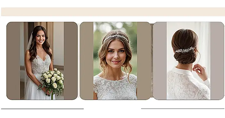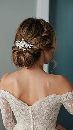 Now, let’s talk about that hair candy! The sparkly, floral-inspired clip isn’t just sitting there looking pretty; it’s practically the VIP pass to looking totally glamorous without overdoing it. It’s the kind of accessory that makes people go, “Wow, her hair looks amazing!” instead of “Wow, is she wearing a tiara from a fantasy movie?” It’s all about finding that perfect balance between fancy and fun, ensuring your bridal style is unforgettable but still totally you. Think of it as your hair’s own personal hype squad, making sure you sparkle from every angle and feel like a total queen.