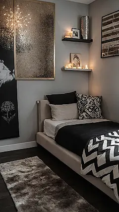 But wait, there’s more wall magic happening! Those sleek floating shelves in the corner aren’t just for show; they’re like tiny stages for your favorite photos, candles (hello, mood lighting!), and that cool metallic vase that might secretly be a rocket ship. Plus, peek at that edgy mask art and the abstract piece – they add a serious dose of cool without trying too hard. It’s proof that bedroom wall decor can be both fun and functional, turning a plain space into a personalized haven where every glance brings a smile (or a little chuckle at how much personality your walls have!). Just be careful not to knock over any candles when you’re dramatically practicing your dance moves!