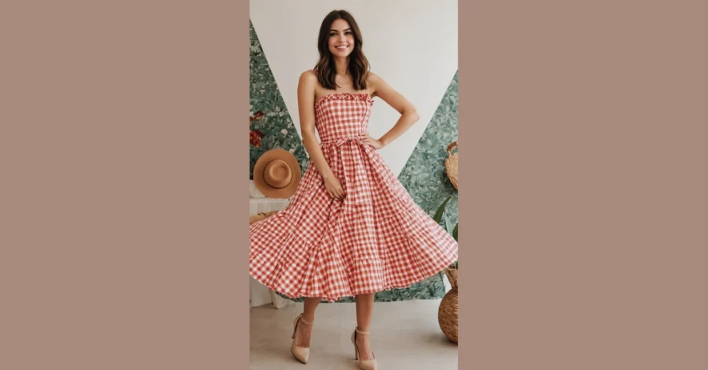 And let’s talk about the magic of a good gingham dress – it’s basically your secret weapon for looking effortlessly cool. One minute you’re ready for a fancy garden party (with those cool heels, obviously!), and the next, you could totally rock it with sneakers and hit up the farmers’ market. This particular red and white number just gives off major happy vibes, making you want to grab a straw hat (like the one in the background!) and find the nearest spot for a photoshoot. Plus, with all those checks, maybe it’s harder to spot a tiny spill? Just kidding… mostly! It’s the kind of outfit that says, ‘I’m here to have a good time and look amazing doing it!’